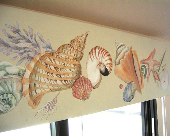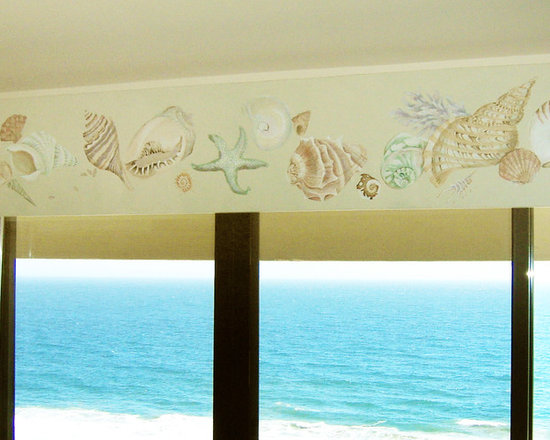 I painted these gorgeous shells on a wooden valence in this beach house in Malibu, CA. The owner wanted something "beachy" to look at in the evenings but did not want anything to of course block the incredible view of the Pacific Ocean.